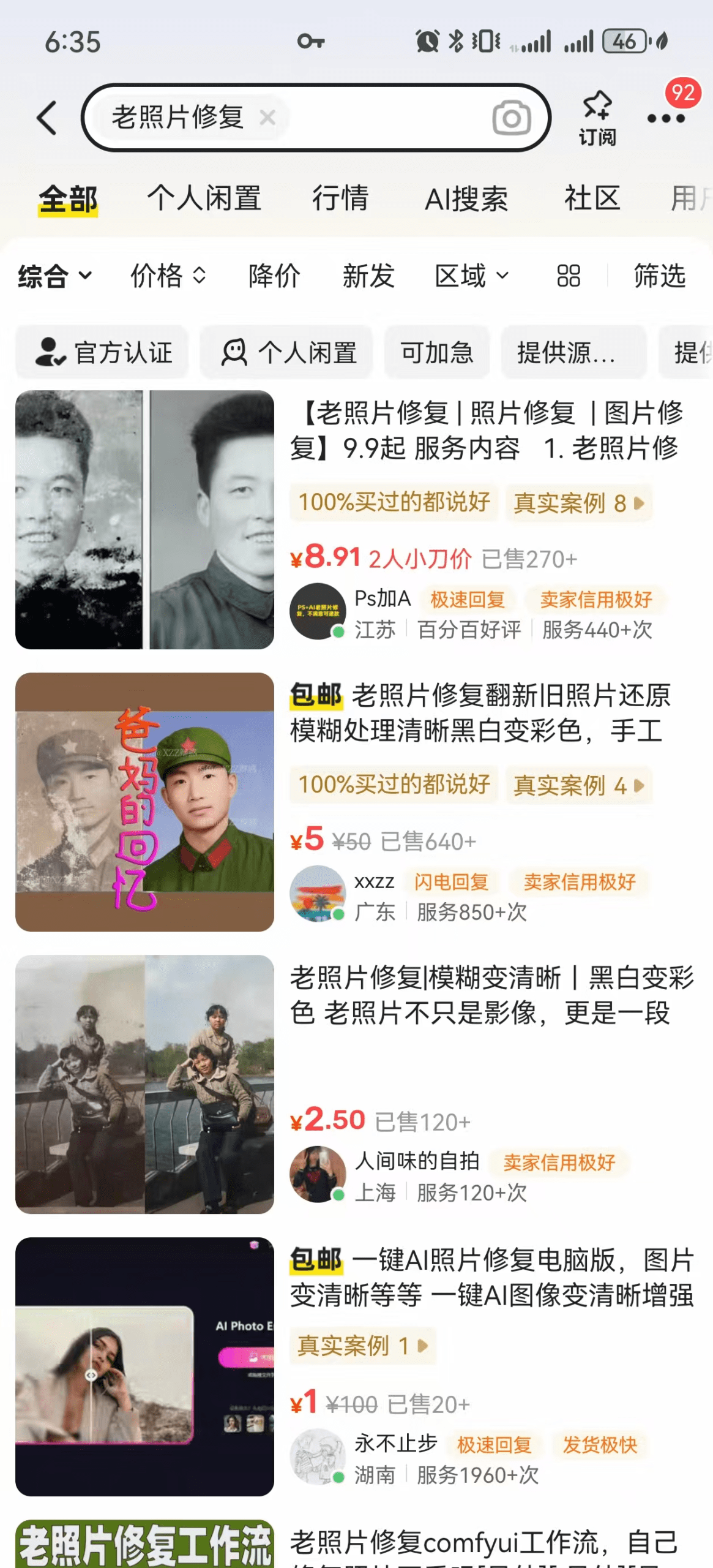 [ri-alerts color=”primary”]AI修复老照片这个简单的生意。 一张泛黄的旧照片,定价10元,卖出了2000多单。这不仅是一个店铺的数据,更是人性里对于弥补遗憾的付费意愿。 你在闲鱼上也能看到,哪怕定价低到2块5,依然有几百人排队买单。看似不起眼的修图生意,实际上是一条隐秘且暴利的现金流。 很多人以为这是手艺活,觉得必须精通PS或者美术功底才能接单。其实不然。这生是拿AI的能力去填补普通人的认知差。对于大多数人来说,让模糊的面孔变清晰是魔法,但对于掌握了工具的人来说,这只是算法的一次常规应用。 操作流程简单得令人发指。 接到客户发来的照片,拖进那些现成的AI修复工具里,甚至不需要你动鼠标微调,等待几十秒生成,导出,发货。那个收了160元的高价单,或许真的有人工精修的成分,但那些几块钱的走量单,大概率就是纯粹的算力搬运工。 生意做到最后,卖的都不是技术,而是情绪价值。技术会贬值,但人们对于记忆的温情永远溢价。 当别人还在苦学PS修图的时候,聪明人已经把AI封装成了情感胶囊,批量卖给了想要留住时光的人。 想入局,别去卷技术,去卷服务和响应速度。毕竟,谁能更快地把握客户的需求,抚平客户心里的那份伤感,谁就能赚到这份钱。[/ri-alerts]