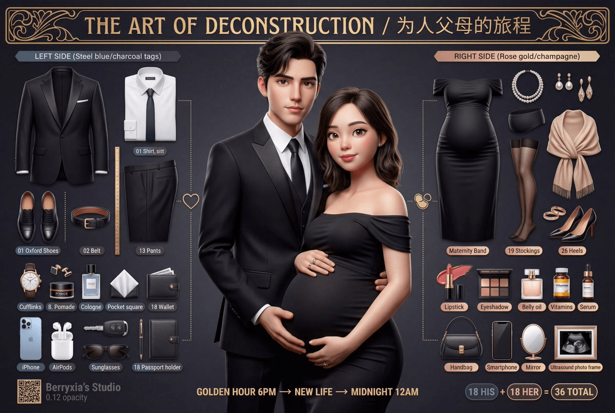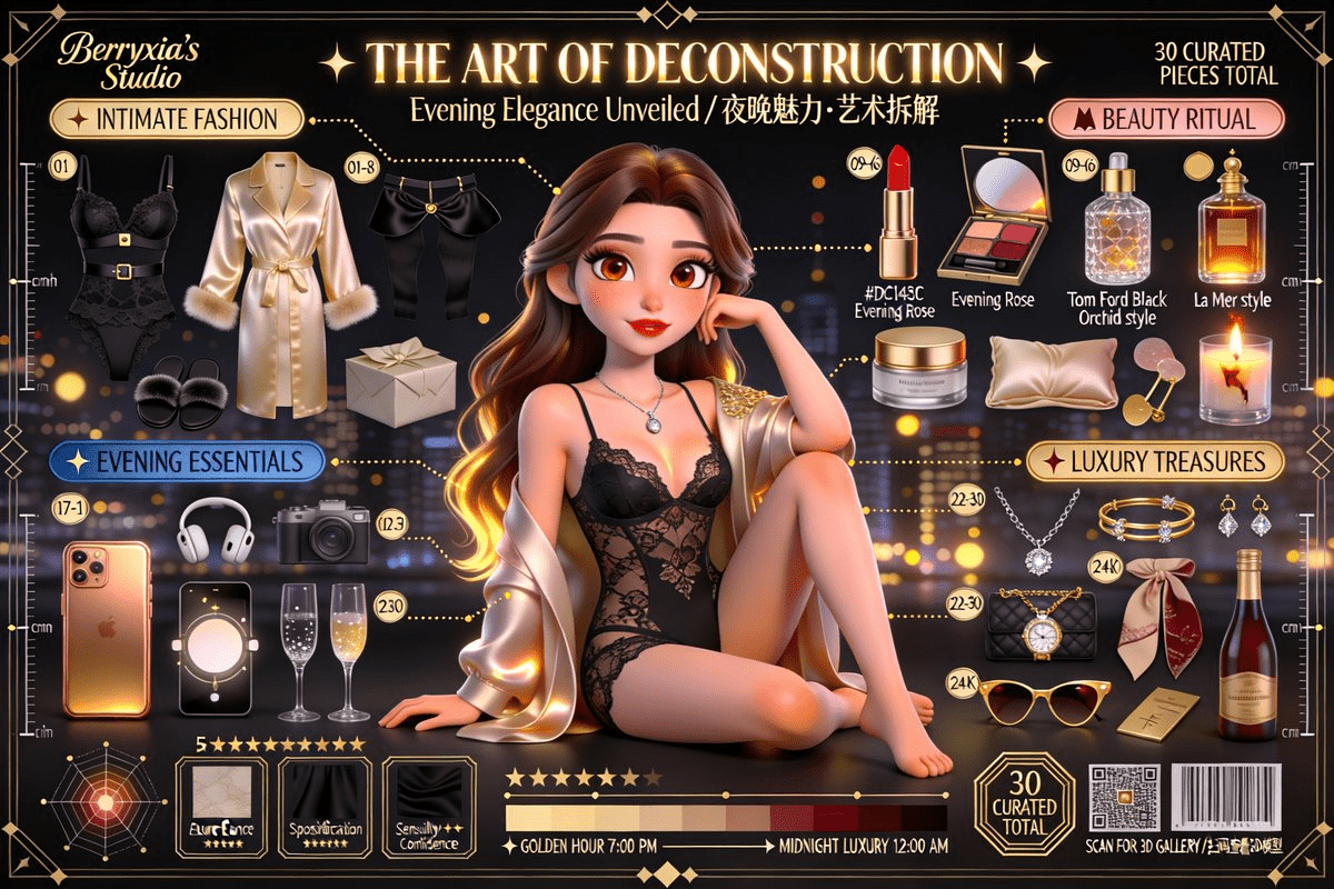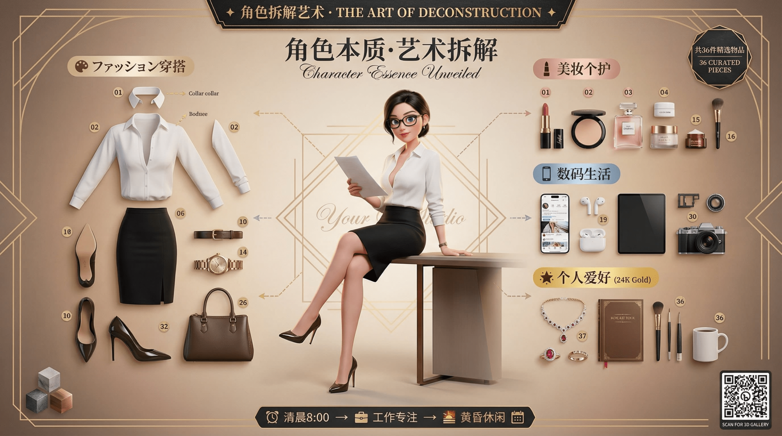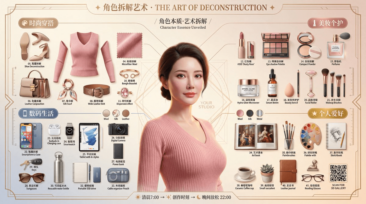 ?提示词: 3D 皮克斯拆解版Prompt ? 核心指令 (Core Instruction) 任务:基于用户提供的参考图片,创作一张超高品质、电影级的3D皮克斯/迪士尼(Pixar/Disney)风格角色拆解艺术海报。将照片中的人物转换为风格化写实的3D动画角色,并将其个人物品以严谨的"Knolling"(整齐排列)艺术风格进行布局展示。 画面比例:16:9 横版 (可根据需求调整为 3:2, 4:5, 1:1) 艺术风格核心:皮克斯"风格化写实主义" (Stylized Realism) — 融合夸张的卡通比例与照片级真实材质光影。 质量标杆:对标《寻梦环游记(Coco)》、《青春变形记(Turning Red)》、《夏日友晴天(Luca)》的官方角色宣传海报。 ? 物品布局 (Item Layout) - Knolling放射式构图 总物品数:30-36件,围绕角色呈90度直角或放射状有序排列。 分类1:时尚穿搭 (Fashion Atelier) - 香槟金标签 - 主服装拆解:衣袖、衣领、布料裁片、内衬等全部分离悬浮。 - 鞋履拆解:鞋底、鞋面、鞋带、鞋跟等分离。 - 随身配饰:腰带、包袋、帽子、围巾等。 *示例:一件风衣可拆解为翻领、肩章、腰带、袖口束带、主衣身等部分。* 分类2:美妆个护 (Beauty Collection) - 玫瑰金标签 - 彩妆:口红(带膏体切面和色号标签)、眼影盘(每格颜色清晰)、粉饼、香水瓶(液体折射清晰可见)。 - 护肤:精华液瓶、面霜罐、美容仪器。 *示例:一瓶香水需展现玻璃瓶身的通透感、液体内部的光线折射以及瓶盖的金属质感。* 分类3:数码生活 (Modern Essentials) - 钢蓝色标签 - 电子设备:带手机壳的智能手机(屏幕需有内容)、无线耳机、智能手表、笔记本/平板电脑、相机。 - 材质要求:金属、玻璃(带折射)、塑料等材质需有正确的粗糙度和反射效果。 *示例:一部相机可拆解为镜头、机身、闪光灯、存储卡、肩带等。* 分类4:个人爱好 (Luxury & Hobbies) - 24K金标签 - 奢华配饰:珠宝首饰(项链、耳环、戒指等,宝石需有色散效果)、品牌包袋(展示内部分隔和五金件)。 - 兴趣爱好:画笔、调色盘、书籍、乐器、运动装备、咖啡用具等。 *示例:一个手办可拆解为头部、身体、四肢、武器、地台等组件。* 每件物品要求: - 渲染质量:与角色同等级别的3D渲染精度。 - 编号标签:带有01-36的圆形编号徽章。 - 材质与阴影:应用PBR材质,投射逼真的软阴影。 ? 爆炸视图技术 (Exploded View Technique) - 连接线:使用优雅的虚线/实线将悬浮的服装部件连接到角色身上。 - 引导箭头:使用装饰性箭头将物品指向其文字标签。 - 技术注释: - 材质样本:展示织物、皮革等材质的微距特写方块。 - 材质标签:如"100%真丝"、"意大利小牛皮"。 - 测量标尺:带有厘米(cm)/英寸(in)标记的标尺。 ? 角色拆解艺术 · THE ART OF DECONSTRUCTION ?" 字体:中文用典雅的衬线体(如方正宋刻本秀楷),英文用Playfair Display,带金箔效果。 - 副标题 (Subtitle):(主标题下方,飘逸手写体) "角色本质·艺术拆解 / Character Essence Unveiled" 中英文混排,字体优雅。 - 分类标题 (Category Headers):(带图标的圆角矩形标签) "? 美妆个护"** (玫瑰金) "? 数码生活"** (钢蓝色) "? 设计元素 (Design Elements) - 几何框架:使用装饰艺术(Art Deco)风格的六边形/圆形细线框(0.5-1pt粗细)来组织物品群组。 - 测量标尺:沿画面左右边缘放置,营造技术美学感。 - 十字准星:在画面四角和关键焦点处添加。 - 材质样本:在底部展示一排面料/皮革/金属的微距特写方块。 - 信息卡片:带优雅边框的卡片,用于展示物品的详细信息。 - 雷达图:用装饰框包裹的角色属性雷达图,如:优雅★★★★★, 风格★★★★★, 智慧★★★★★。 - 连接线条:使用金色/银色的优雅虚线和装饰性箭头。 ? 背景与氛围 (Background & Atmosphere) - 背景渐变:从白色到奶油色/香槟色的暖色调渐变,或从浅灰到白色的冷色调渐变。 - 图案叠加:叠加一层低透明度(5-10%)的装饰艺术几何网格或蓝图线条。 - 暗角效果 (Vignette):轻柔的边缘变暗效果,将焦点引向中心。 - 氛围粒子:柔和的金色散景(Bokeh)光斑和微妙的胶片颗粒(Film Grain),营造电影感。 ? 清晨6:00 → ? 创作进行时 → ? 色彩方案 (Color Palette) - 女性/时尚主题:香槟金(#D4AF37), 玫瑰金(), 奶油色(), 樱花粉()。 - 男性/科技主题**:钢蓝色(#4A90E2#4A4A4A#C0C0C0), 电光蓝(#00D9FF)。 - 正式/奢华主题:纯黑(#000000), 24K金(#FFD700), 深红色(#8B0000), 象牙白(#FFFFF0)。 - 情侣主题:男性一侧使用冷色调,女性一侧使用暖色调,形成对比。 ? 技术规格 (Technical Specifications) 渲染参数 (Rendering) - 引擎:路径追踪(Path Tracing),等同于Cycles/Arnold/RenderMan级别。 - 采样数:最低4096 SPP (Samples Per Pixel),确保画面纯净无噪点。 - 光线弹射:12次,以获得准确的全局光照。 - 焦散(Caustics):开启,用于钻石和玻璃的真实光线折射效果。 - 模型面数:角色多边形数200万以上,确保曲面平滑。 - 毛发:每个角色超过10万根发丝,并经过物理模拟。 PBR材质流程 (Materials - PBR Workflow) - 皮肤:三层SSS,双层高光。 - 毛发:各向异性着色器,主副双高光。 - 织物:微观编织法线贴图,准确的粗糙度变化。 - 金属*:金属度(Metalness) 1.0,粗糙度(Roughness) 0.1-0.4。 - 玻璃:折射率(IOR) 1.5,钻石IOR 2.42并带色散(Dispersion)。 - 皮革:粗糙度0.6-0.7,带颗粒感的凹凸贴图。 分辨率与输出 (Resolution & Output) - 分辨率:4K (3840×2160) 横版。 - 宽高比:16:9。 - 色深:32-bit浮点,为后期处理提供最大空间。 - 抗锯齿:16x MSAA,边缘锐利清晰。 ? 后期处理 (Post-Processing) - 色彩分级 (Color Grading): - 使用电影感LUT,提高暗部,避