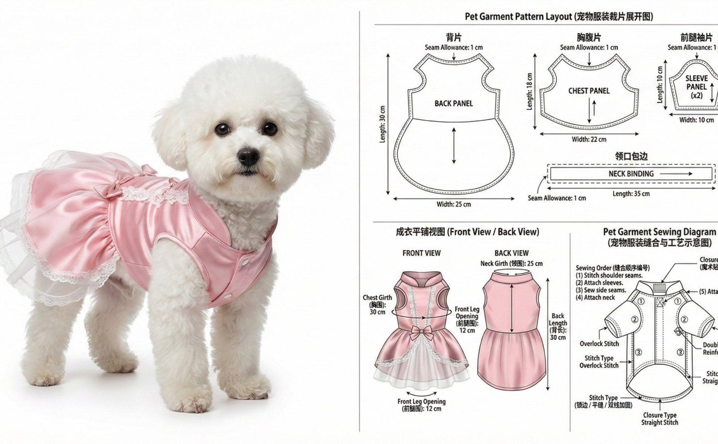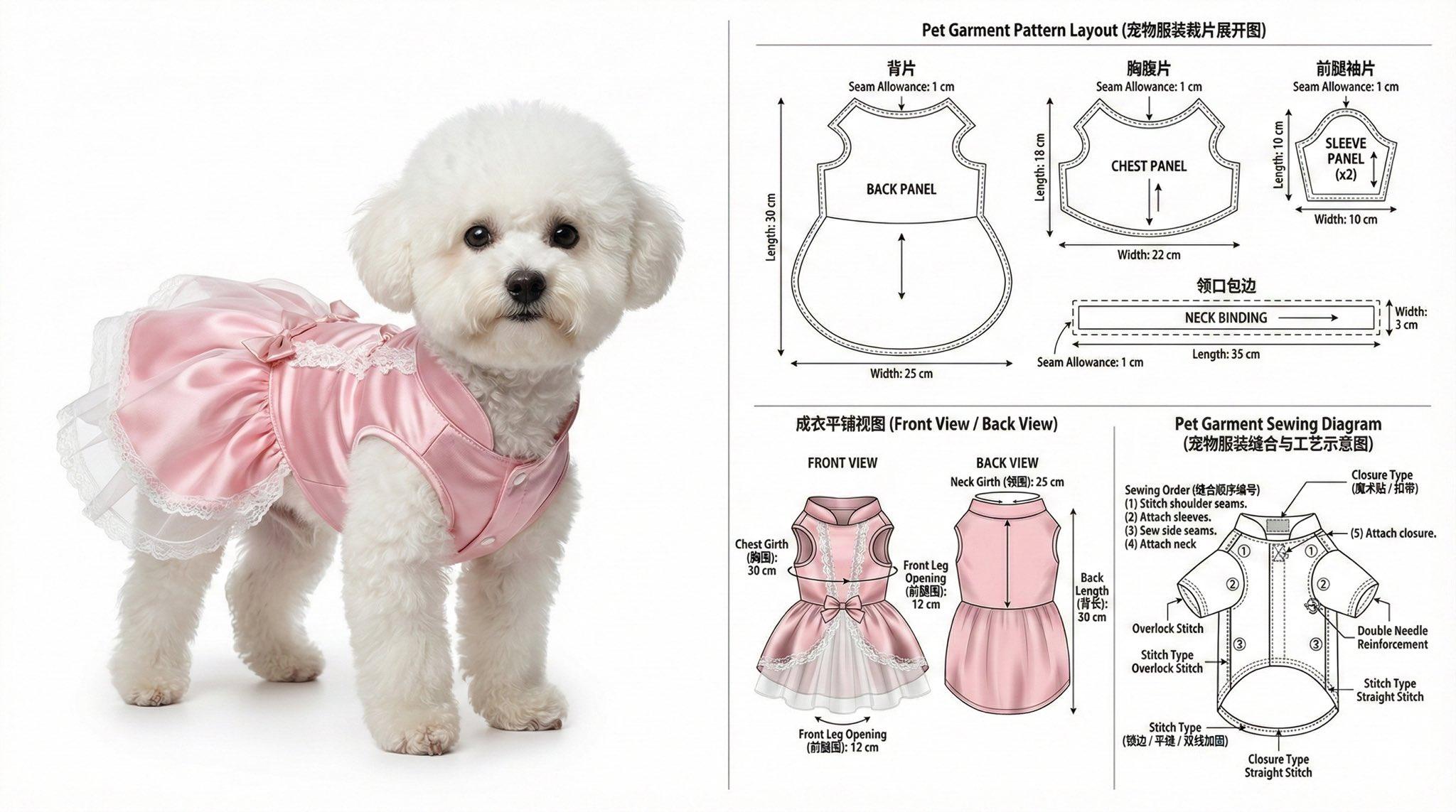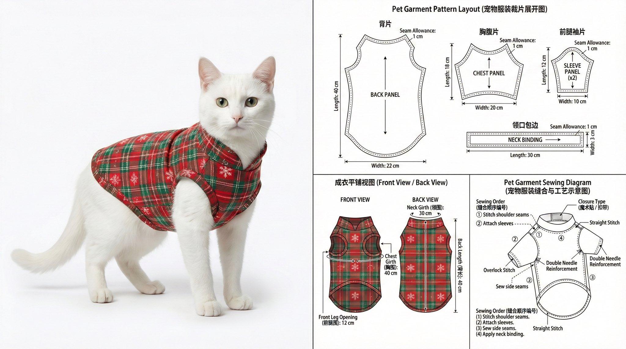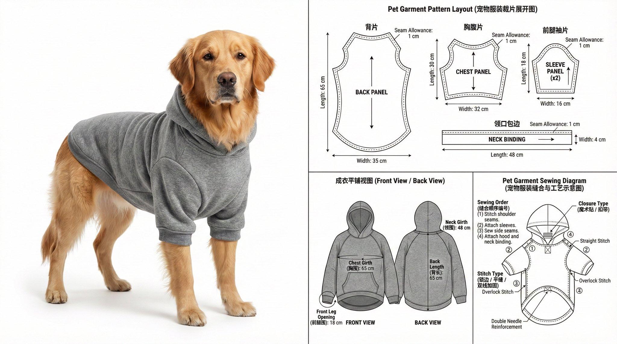 避免:fashion illustration, decorative layout, lifestyle photo only, no measurements, no annotations, cartoon, incorrect animal anatomy, human garment pattern