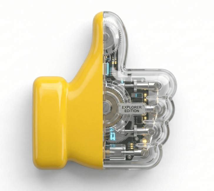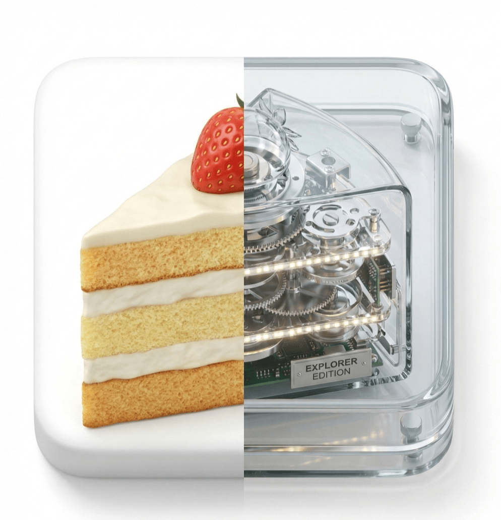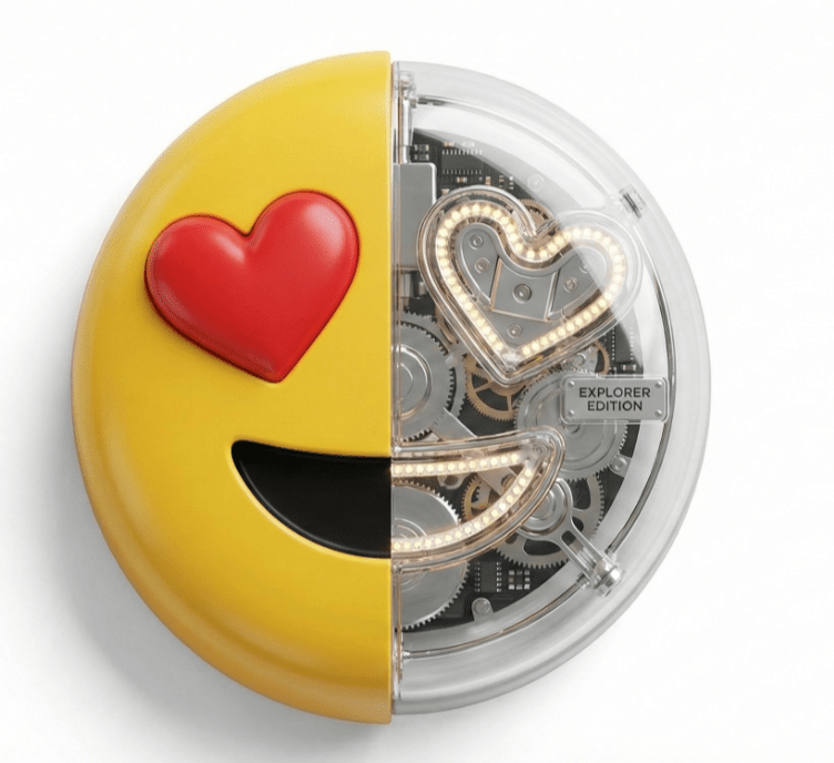 生成图片,正方形 透明探索版的 emoji 图标,3d,产品摄影,纯白背景,正交相机 45 度,top to bottom,产品被垂直分为两部分,左半部分是原始的样式,右侧是透明材质,需要绘制的图标是:?